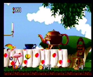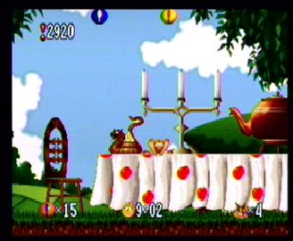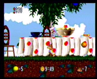 Background: Your a Bobcat named Bubsy who must travel through several fractured fairytales such as Alice and Wonderland, Jack and the Beanstock, Hansel & Gretel, and Arabian Nights. Along the way you must battle such baldies as Tweedle Dum and Tweedle Dummer, soldier playing cards, and punk flamingos.Game Play: At first brush this game looks promising. The cartoon like graphics are nice and the storyline is fairly original. However soon thereafter your optimism turns to frustration. First of all every time you die Bubsy states “Oh sure, lets torch the Bubster.” This would not be so bad except you die often. The lack of control over the Bubster is the downfall of this game. He will often get away from you and end up running into an enemy. Bubsy only needs to run into an enemy once and he dies. This is somewhat mitigated by the many lives you start with, however even that is not enough. Perhaps if you can be patient enough you can master the controls, but this is suppose to be fun not work