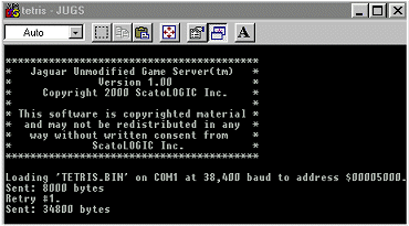 It should be mentioned that JUGS only uploads files in the .bin format. You will find other files in formats such as .abs, .jag, or .cof. Currently, you can transfer .abs to .bin with the included JUGS software and .jag to .bin with a utility found on Just Claws. There is no utility to transfer .cof files as of yet but this may change in the future. Also, game files in a .rom format can not be run because the Jaguar does not have enough ram memory.1